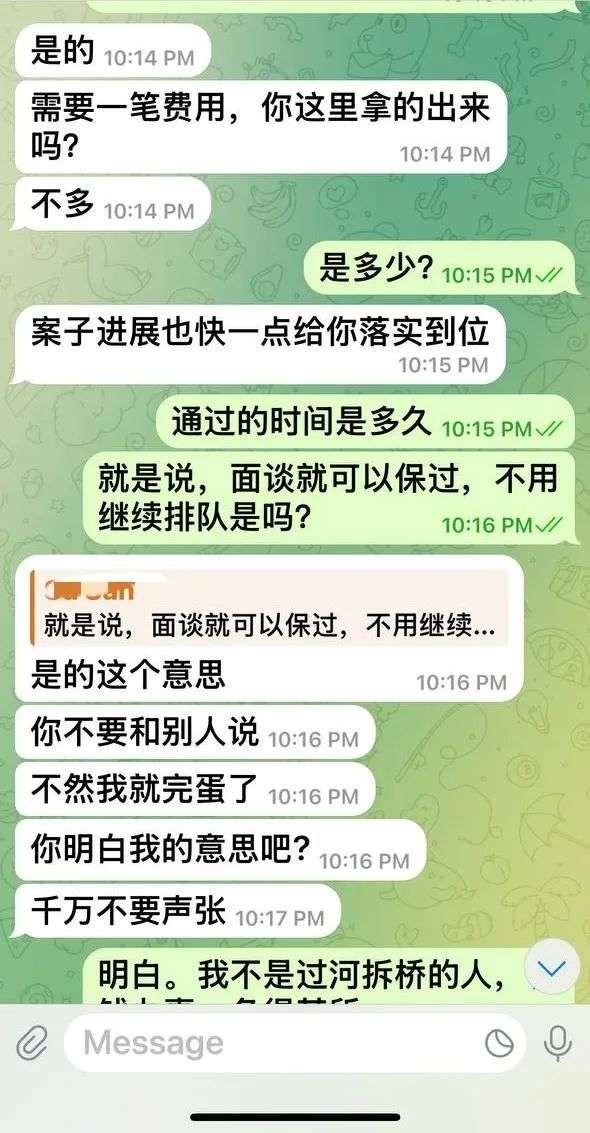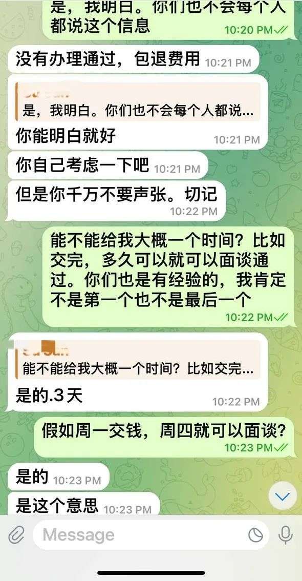 随后,诈骗分子称,需要3万至5万美元打理费,可以在3天之内安排面谈,并且包通过。