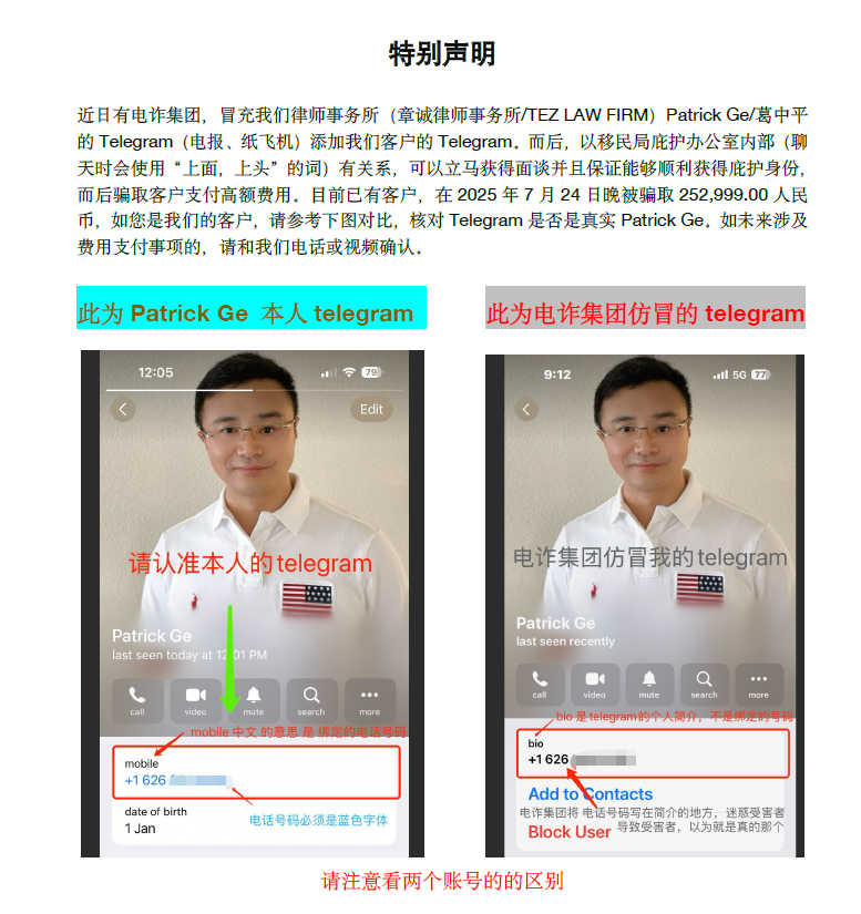 为此,章诚律师事务所发表了一份声明,表明有人在社交媒体“纸飞机”上冒充该律师事务所,并以有内部关系为由,可以立即获得面谈骗取客户高额费用,如涉及支付费用的,请打电话或者发视频确认。