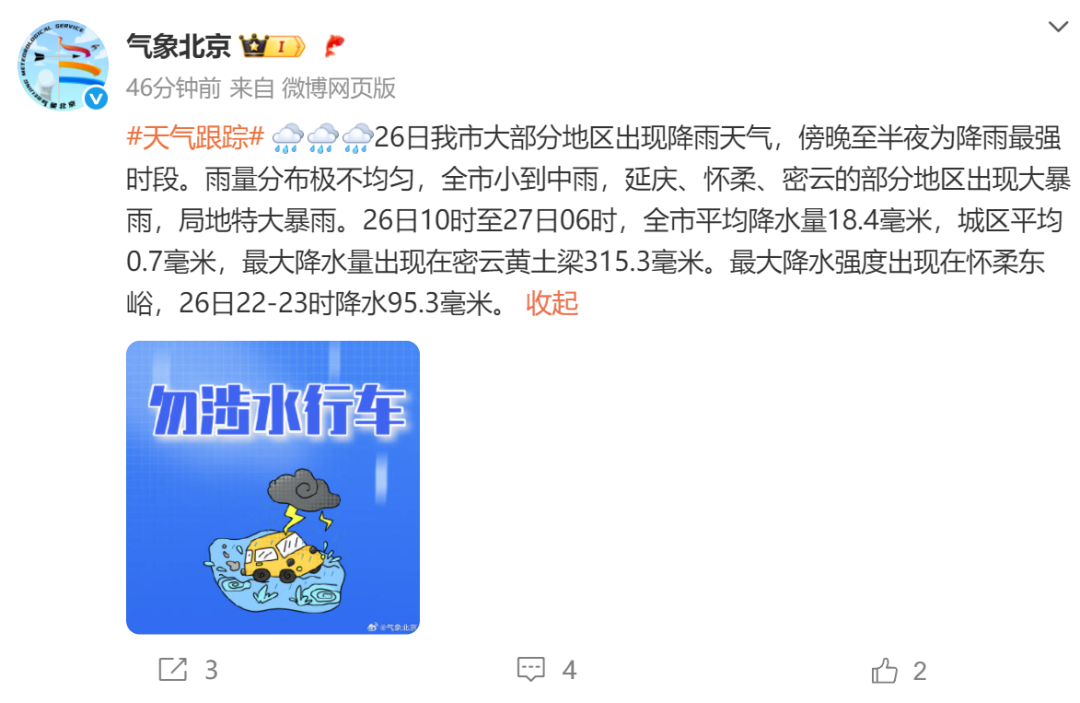@气象北京消息,26日北京市大部分地区出现降雨天气,傍晚至半夜为降雨最强时段。雨量分布极不均匀,全市小到中雨,延庆、怀柔、密云的部分地区出现大暴雨,局地特大暴雨。26日10时至27日06时,全市平均降水量18.4毫米,城区平均0.7毫米,最大降水量出现在密云黄土梁315.3毫米。最大降水强度出现在怀柔东峪,26日22-23时降水95.3毫米。