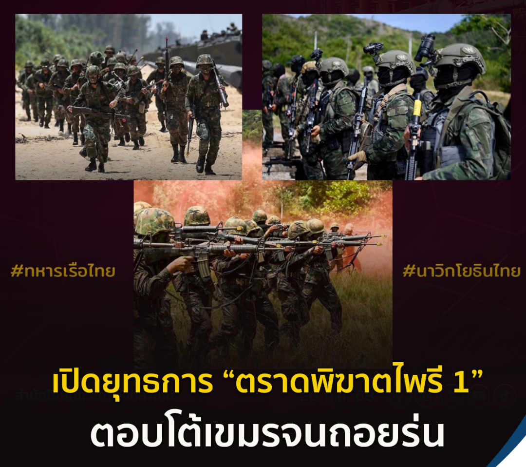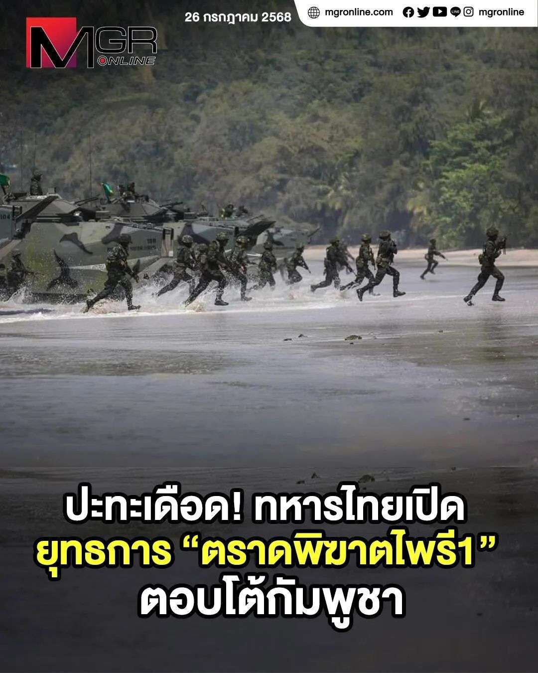 据多家泰国主流媒体7月26日上午最新报道,面对柬埔寨部队在边境地区的持续进攻,泰国军方于26日清晨正式启动代号为 “Trat Pikhat Pairee 1”(达叻驱敌一号) 的军事行动,派遣海军部队展开反击,同时强化边境防线,严守国家主权。