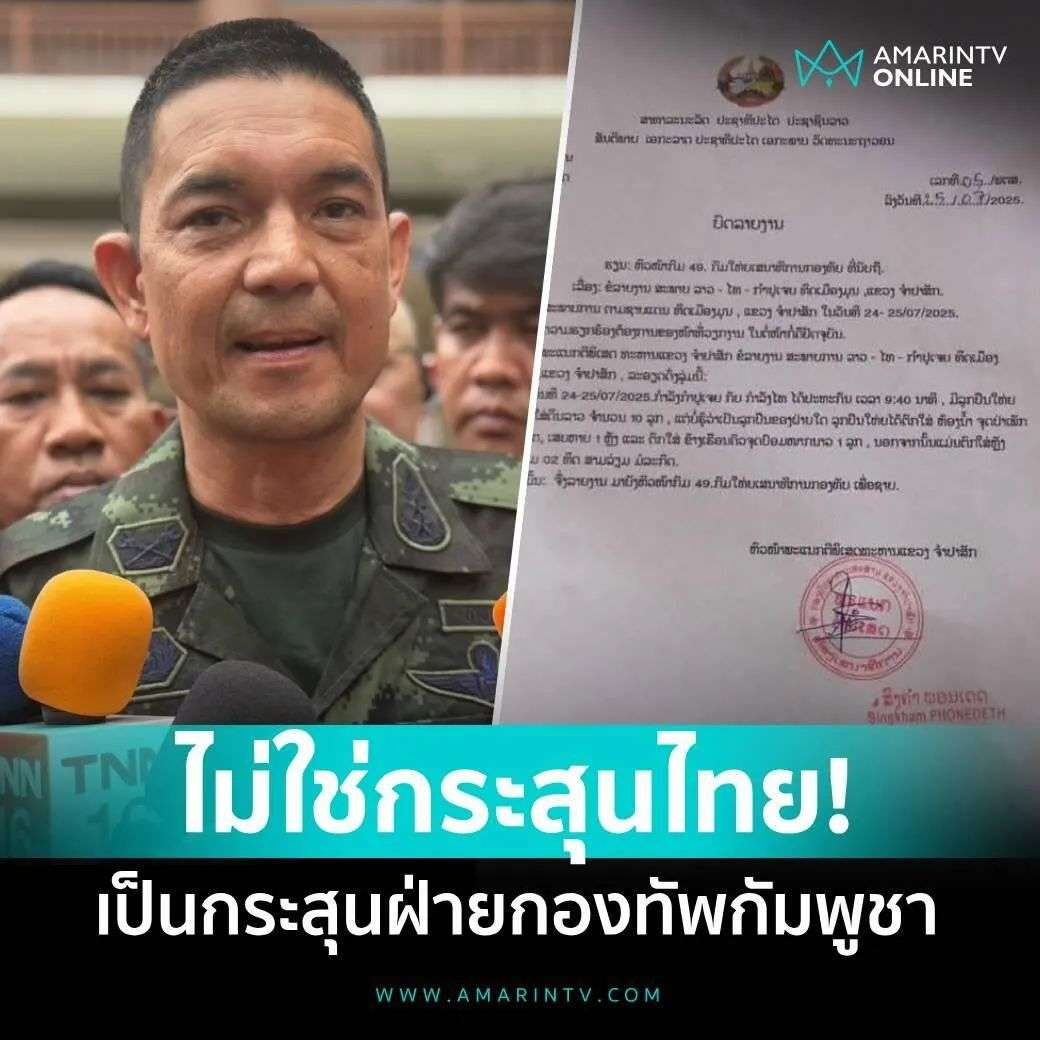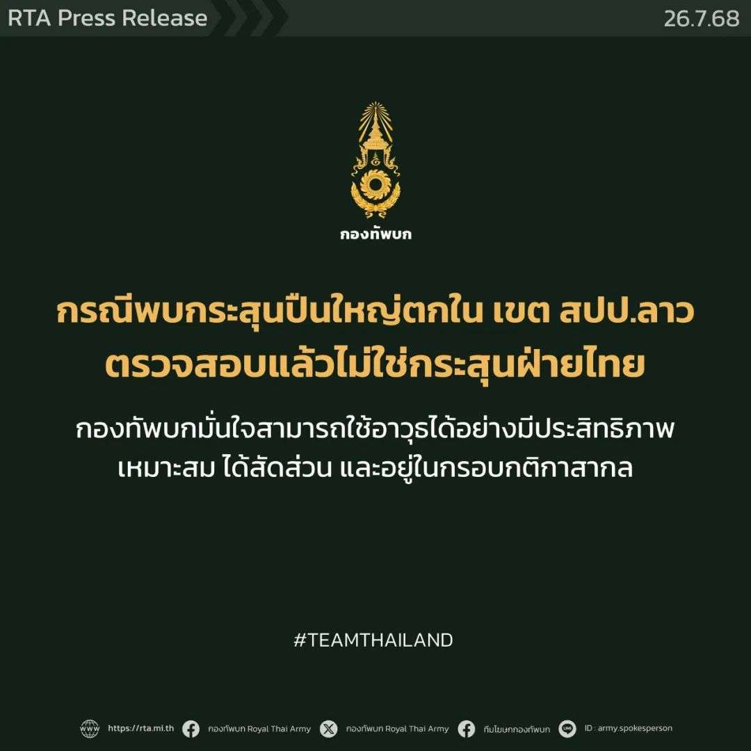 据多家泰国媒体7月26日报道,围绕近期泰柬边境冲突中出现的炮弹落入老挝境内事件,泰国第二军区司令部通过社交媒体平台发布声明,正式澄清相关弹药非泰军所发射,其来源为柬埔寨军队。