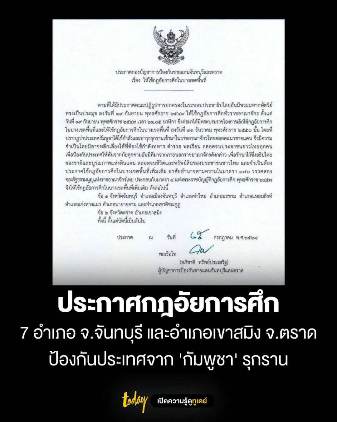 自7月26日起,在尖竹汶和达叻两府共八个行政区实行警戒,立即生效。