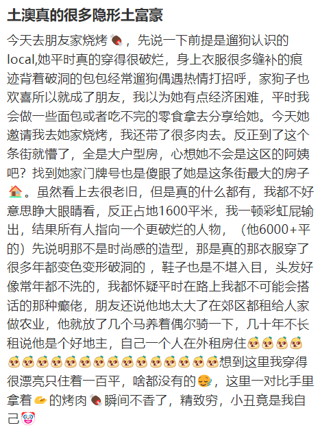 虽然这也不是百分百准确,但是不少网友都分享了周围的“隐形土豪”,足以证明在澳洲,有钱人不注重打扮是个很普遍的事儿。