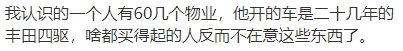 我认识的一个人有60几个物业,他开的车是二十几年的丰田四驱,啥都买得起的人反而不在意这些东西了。