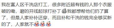 我在富人区干洗店打工,很多附近超有钱的人那个衣服破的嘞,磨的开线起球打补丁我都想帮他们扔了算了,但是人家补补还穿,而且补和干洗的钱完全够买新的了,人家就不
