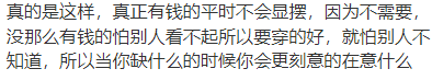 甚至有网友发表扎心言论,没钱的怕别人看不起所以要穿的好,所以当你缺什么的时候你会更刻意的在意什么。