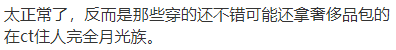 说到以貌取人,不少网友还提到,那些穿着名牌衣服拿着奢侈品包包的人,反而有可能是月光族,主打一个精致穷。