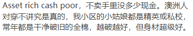 Asset rich cash poor,不卖手里没多少现金。澳洲人对穿不讲究是真的,我小区的小姑娘都是精英或私校,常年都是干净破旧的全棉,越破越好,但身材超级好。