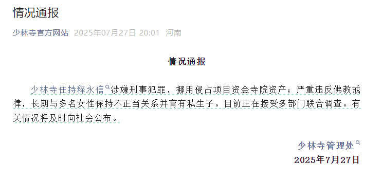 7月27日晚,“少林寺官方网站”微信公众号发布情况通报: