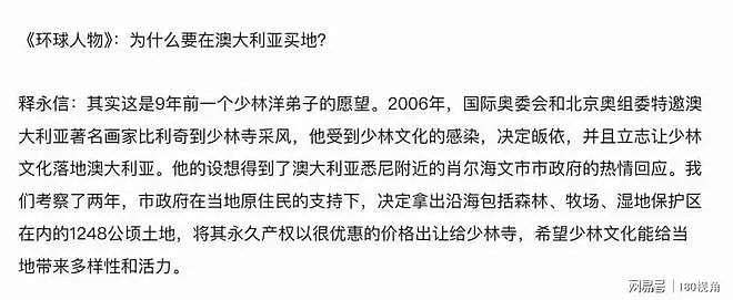 当时释永信曾为此接受过采访,表示在澳洲买地是为了圆洋弟子一个心愿,为此少林整整考察了两年。