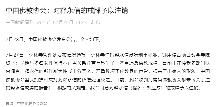 28日,中国佛教协会发布通报:对释永信的戒牒予以注销。