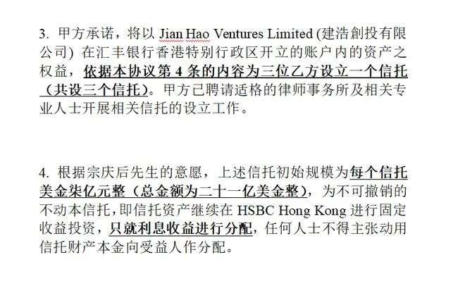 协议中提到,宗馥莉承诺,将以建浩创投有限公司在汇丰银行账户内的资产之权益,为“宗家三兄妹”设立三个信托。