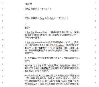 一是宗馥莉代宗庆后持有建浩创投有限公司(Jian Hao Ventures Limited)资产,公司登记股东为宗馥莉,宗庆后为唯一董事;