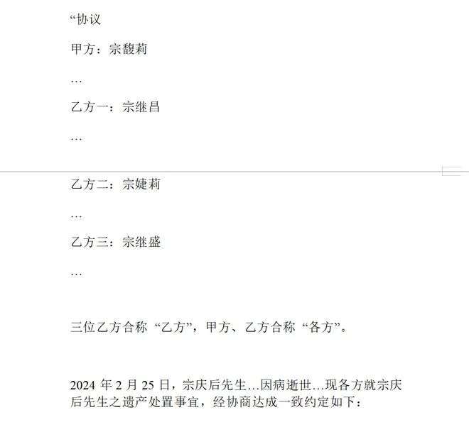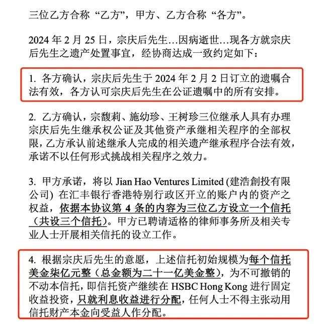 同时,协议约定宗馥莉需按要求完成信托设立,不得阻碍资产交付,受益人则需配合遗产继承等手续,不得妨碍遗嘱执行或公司经营。
