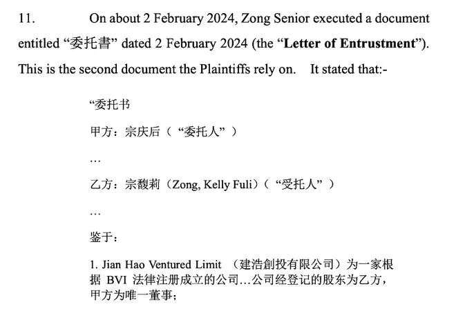 判决书还展示了一份委托书。委托书中提到宗庆后与宗馥莉就运用建浩创投有限公司存放于汇丰银行账户中的17.99亿美元资产设立境外信托的相关事宜达成协议。