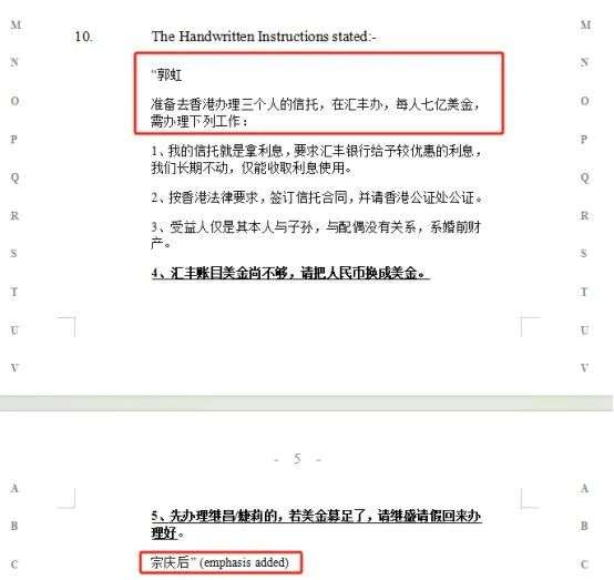 在这份文件中,宗庆后指示郭虹“准备去香港为三个人办理信托,在汇丰办,每人七亿美金”;当中写到,该信托“长期不动,仅能收取利息使用”。