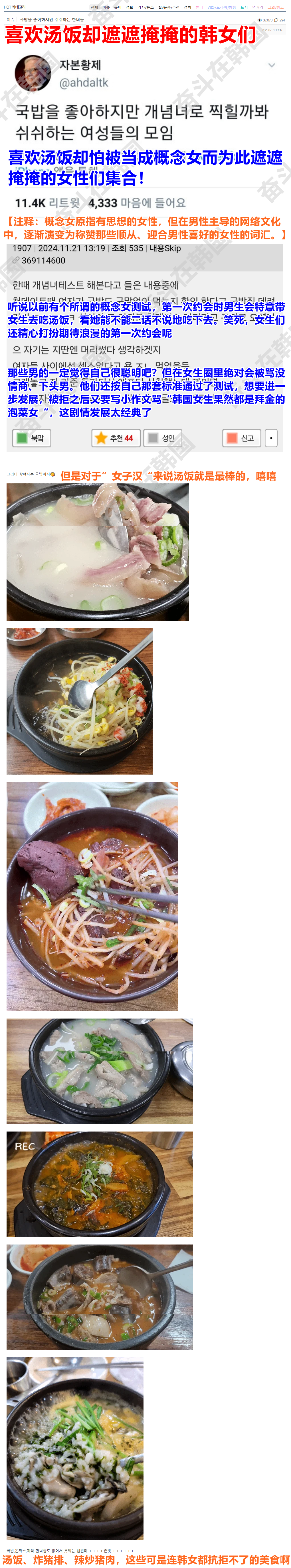 吃汤饭就成了概念女,吃炸猪排、辣炒猪肉也成了概念女,说实话,韩男是不是想要独占美食才搞出这种测试。