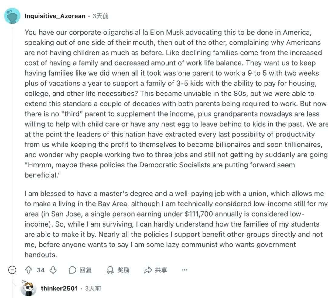 更有态度激烈者,将矛头直指马斯克——这位996精神的“美国代言人”。一位名为Inquisitive_Azorean的网友表示:“我们那些像埃隆·马斯克一样的商业寡头,一方面在鼓吹要在美国实行这些事情,另一方面又在抱怨美国人生育率下降”。