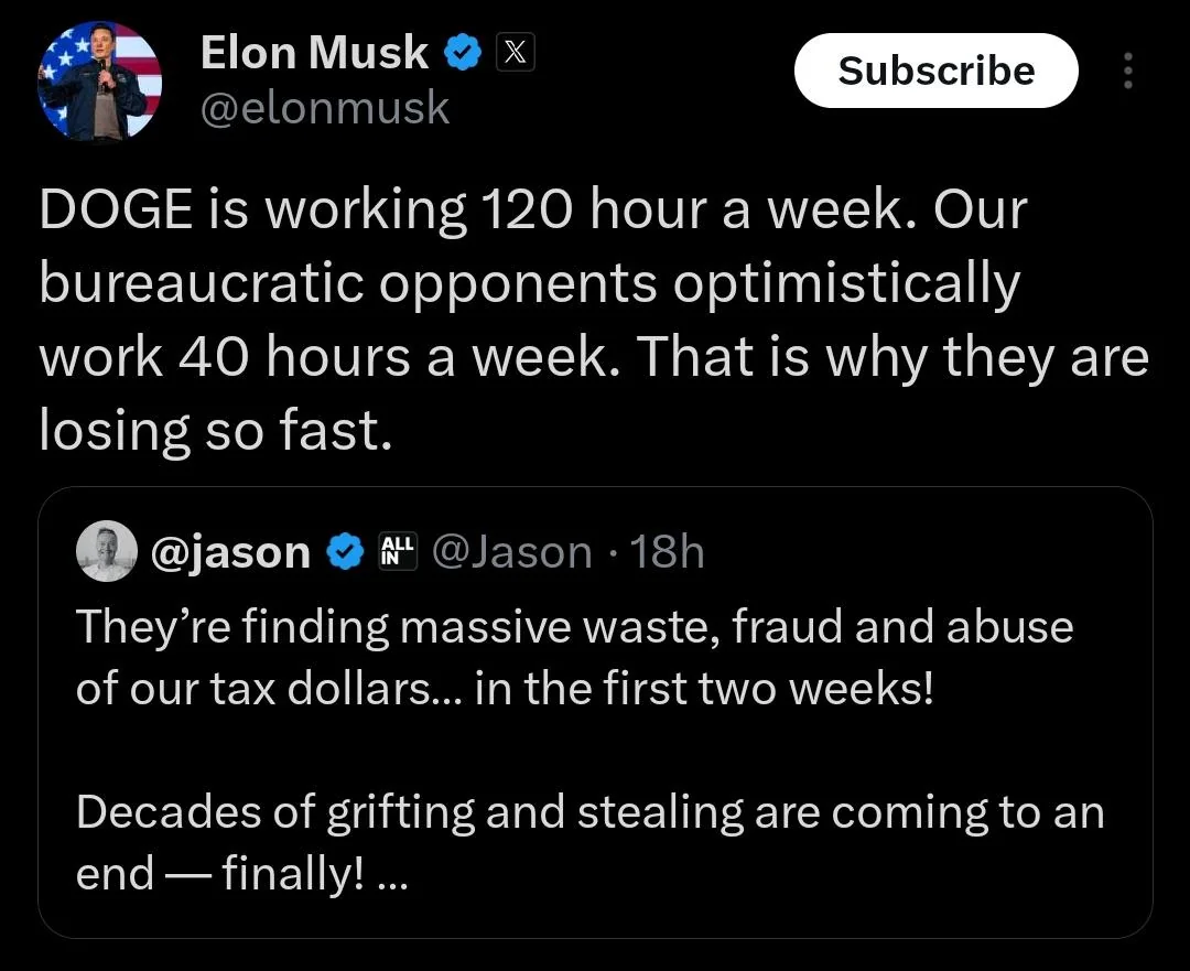最近一年来,马斯克更是仿佛成仙了,直接突破80小时的痛苦阈值,他宣称,自己领导的政府效率部团队成员平均每周工作120小时,日工作时长达到令人咂舌的17.1小时,可以说“两眼一睁,就是干”!