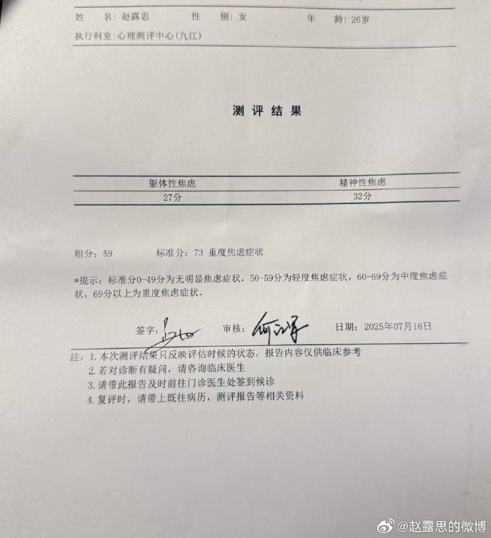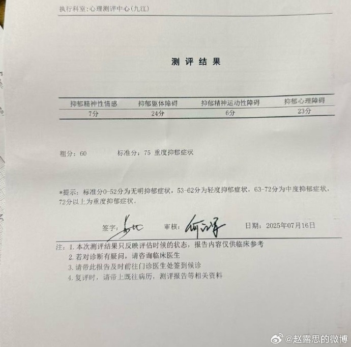赵露思还晒出7月的心理测评结果,显示有“重度抑郁症状”。