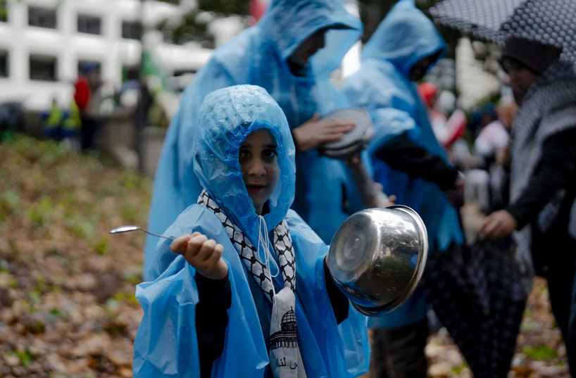 他们敲着鼓,敲着他们带到现场的锅碗瓢盆,象征着加沙的饥荒。
