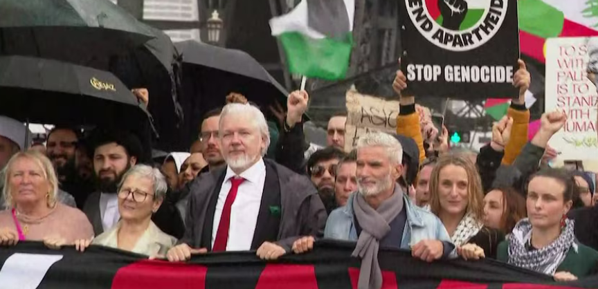 现场画面显示,游行的队伍中包括前不久刚刚获释的维基解密创始人朱利安·阿桑奇及前澳大利亚足球国家队队长克雷格·福斯特: