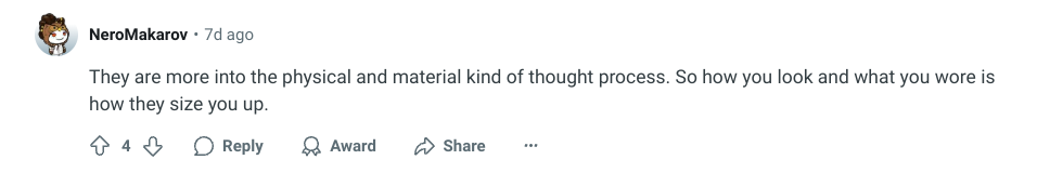 “他们更注重物质和外貌。所以,你的外表和穿着打扮就是他们衡量你的标准。”