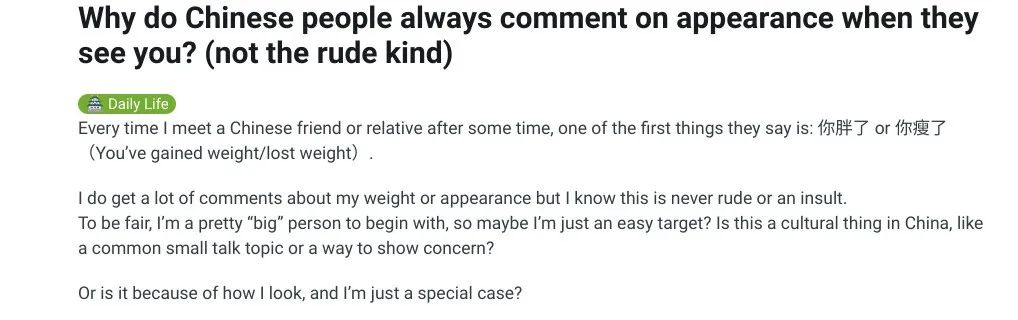 最近,就有不是很了解这种打招呼方式的网友在国外论坛上发帖,表示自己很疑惑,为什么中国人见面的时候总是会评价别人的外貌?