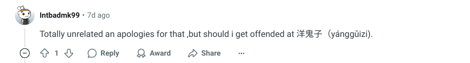 “借楼插一句完全不相关的嘴,我对此表示歉意,但我应该被人叫我‘洋鬼子‘而感到生气吗?”