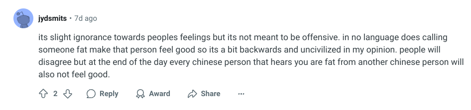 “在中国谈论体重/健康就像在西方谈论天气一样。没什么冒犯性,只是闲聊/打破僵局而已。”