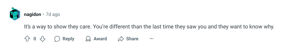 “这是他们表达关心的一种方式。你和上次见面时不一样了,他们想知道为什么。”