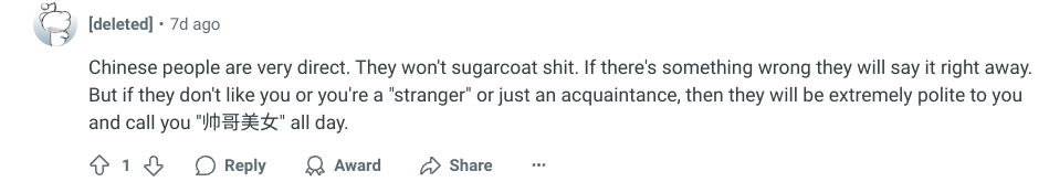 “中国人很直接,不会粉饰太平。如果有什么不对劲,他们会立刻说出来。但如果他们不喜欢你,或者你只是个’陌生人’或者不是和他们很熟的人,他们就会对你非常客气,整天叫你’帅哥美女。”