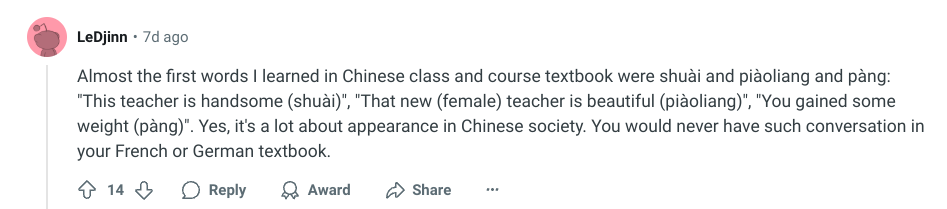 “我在中文课堂和教科书上学到的第一课几乎都是‘帅、‘漂亮‘和‘胖‘:‘这位老师真帅,那位新来的女老师真漂亮,你胖了。是的,在中国社会,外貌很重要。在法语或德语课本里,你绝对不会看到这样的对话。”