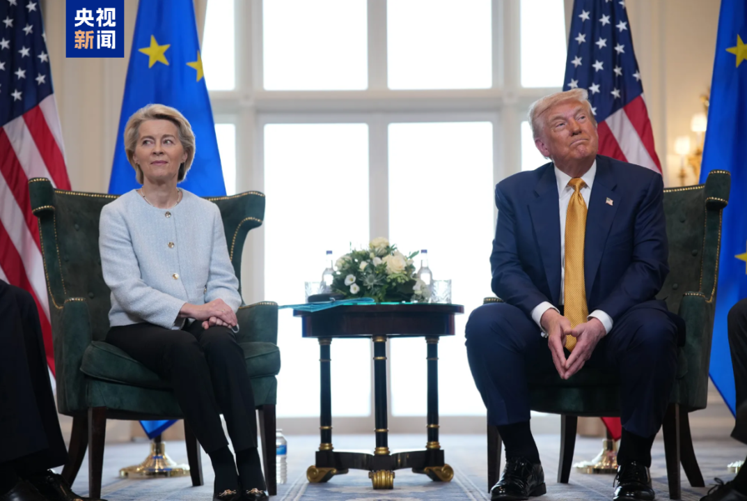 7月27日,欧盟委员会主席冯德莱恩(左)与美国总统特朗普(右)举行会晤。图源央视新闻