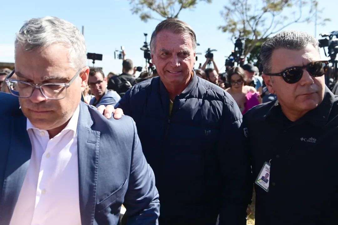 7月18日,在巴西首都巴西利亚,前总统博索纳罗(中)被戴上电子脚镣后离开警方机构。图源新华社