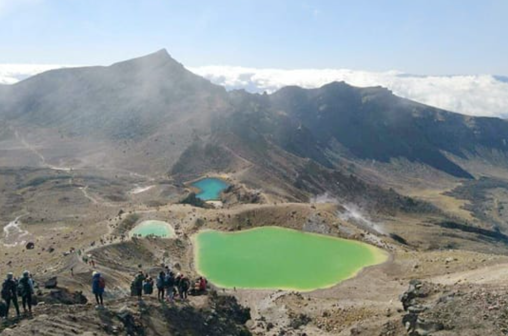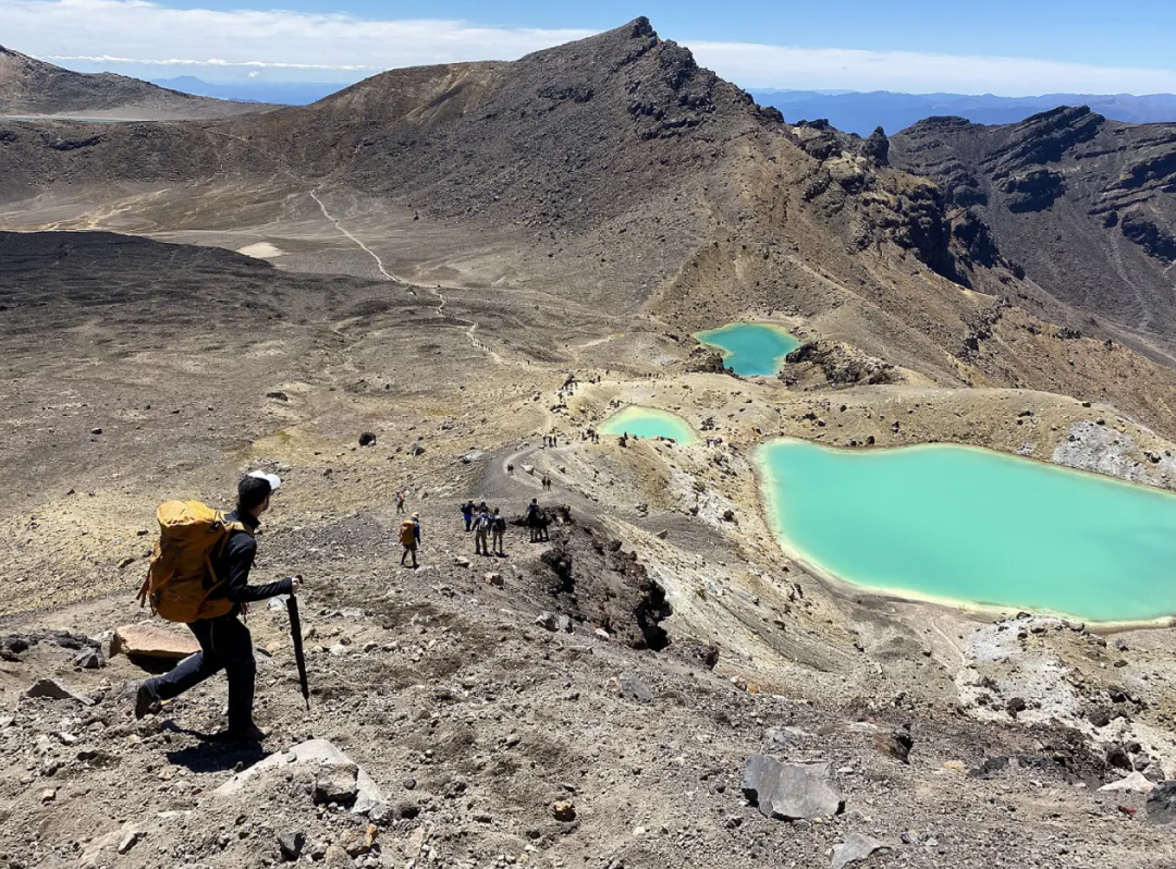 这条步道横跨活火山汤加里罗山与纳乌鲁赫伊山之间,沿途可以欣赏到月球般的红色火山口、沸腾地热区、翡翠色的火山湖与蓝湖,风景壮丽又多变。