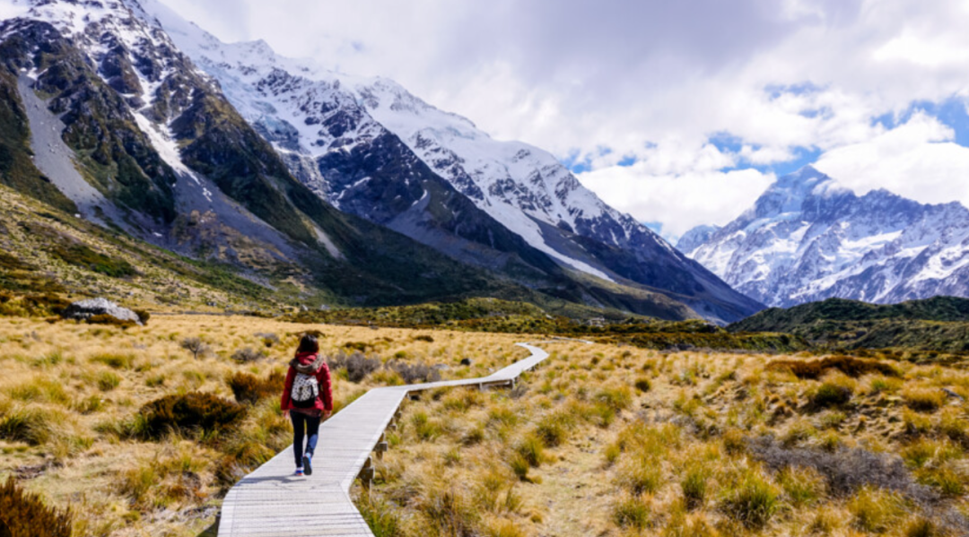 作为全球十大冰川徒步目的地之一,库克山国家公园内的胡克谷步道(Hooker Valley Track)只需约三小时徒步,便能轻松抵达冰川湖畔,近距离仰望这座“云中之山”。