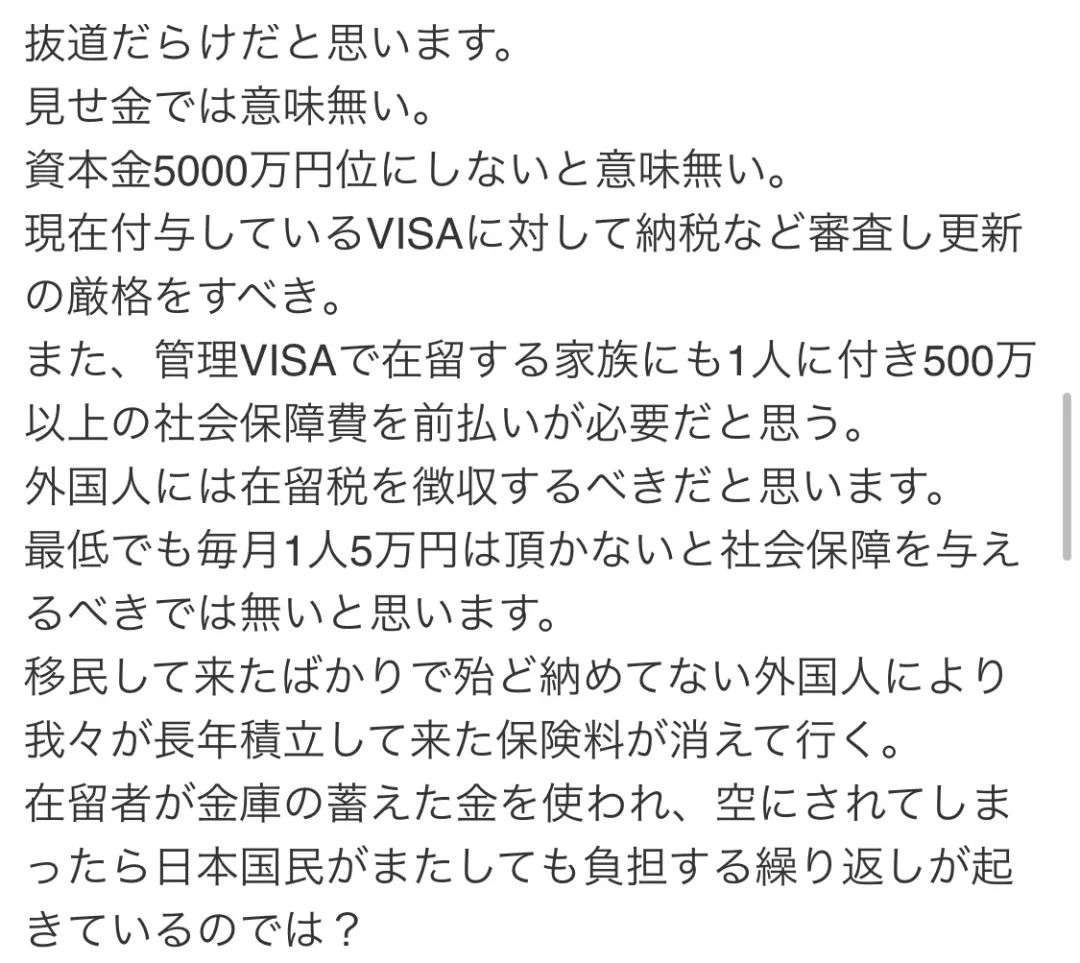 另外,我认为,对于以“经营管理签证”在留的外国人家庭成员,每人应提前支付500万日元以上的社会保障费用。