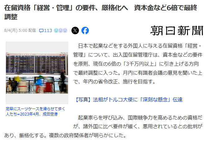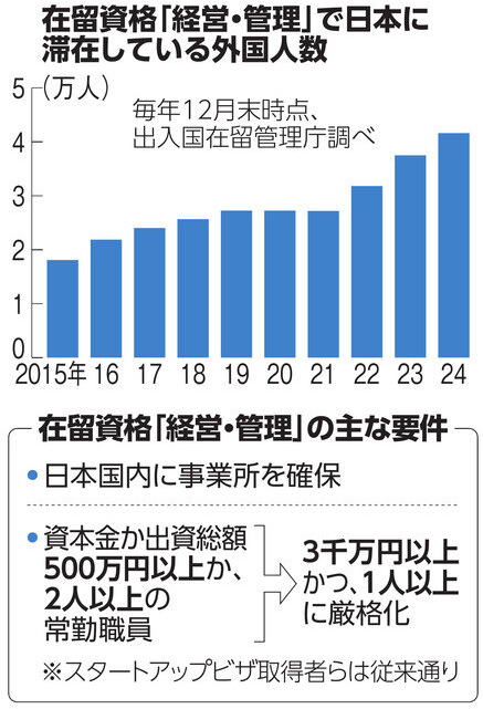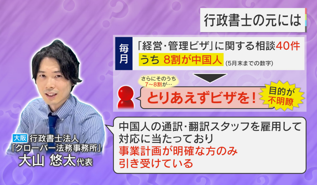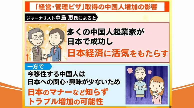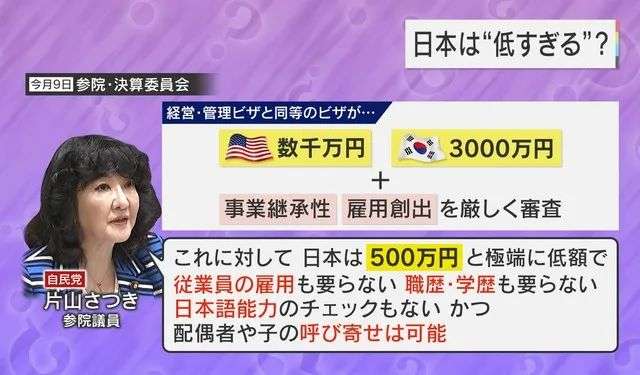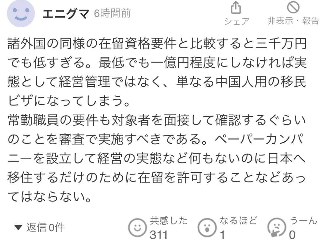 “与其他国家的类似在留资格要求相比,三千万日元的标准也过于低廉。若不将其提高至至少一亿日元的水平,实际上这将不再是“经营管理签证”,而只是专供中国人使用的移民签证而已。