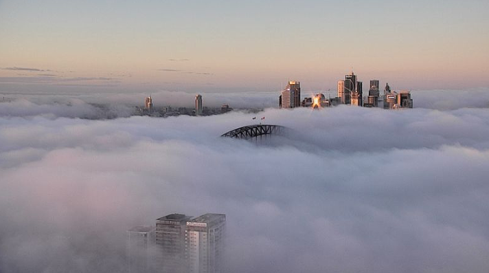 媒体发出的图片可以看出,整个悉尼都被白茫茫的雾气封锁,除了一些超高层建筑的顶层,其他建筑基本都看不到了。