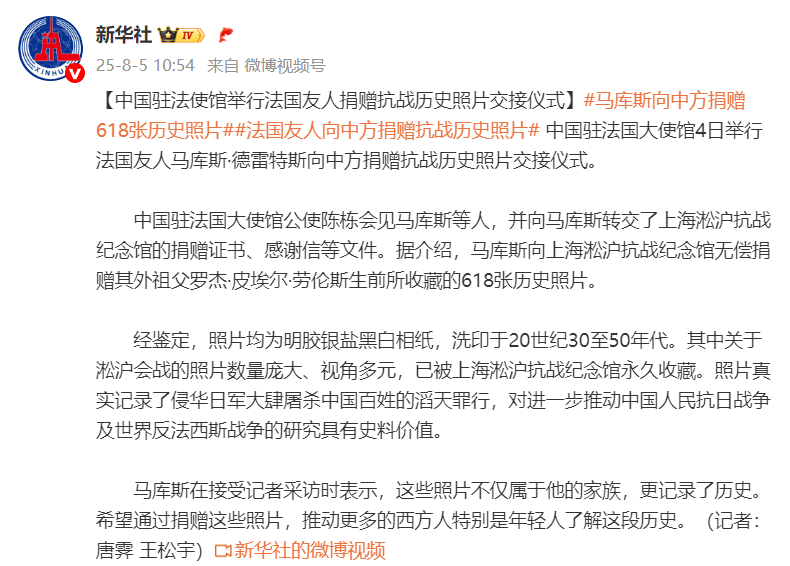 8月5日,据新华社消息:中国驻法国大使馆4日举行法国友人马库斯·德雷特斯向中方捐赠抗战历史照片交接仪式。