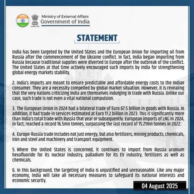 当天,印度外交部发布声明,回应威胁的同时,也指出美欧在俄罗斯问题上的双标。