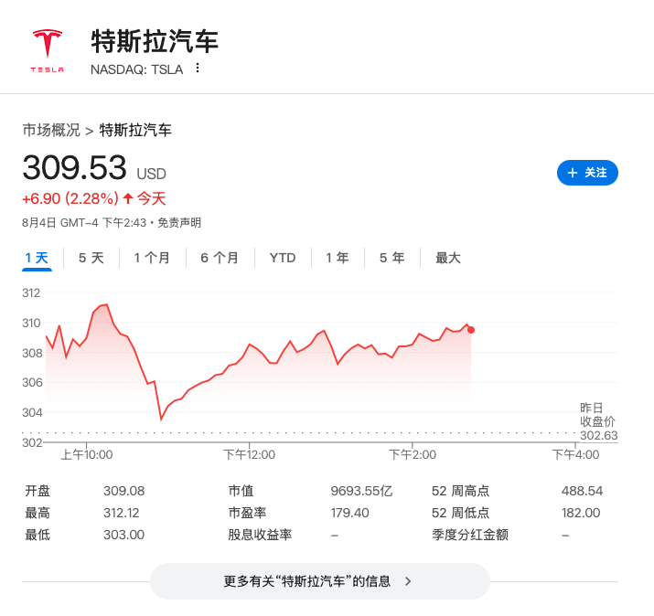 消息公布后,特斯拉股价周一一度上涨3.1%,至每股312.12美元,随后涨幅回落至2.3%左右。截至上周五收盘,该公司今年股价已累计下跌25%,而标普500指数同期上涨6%。
