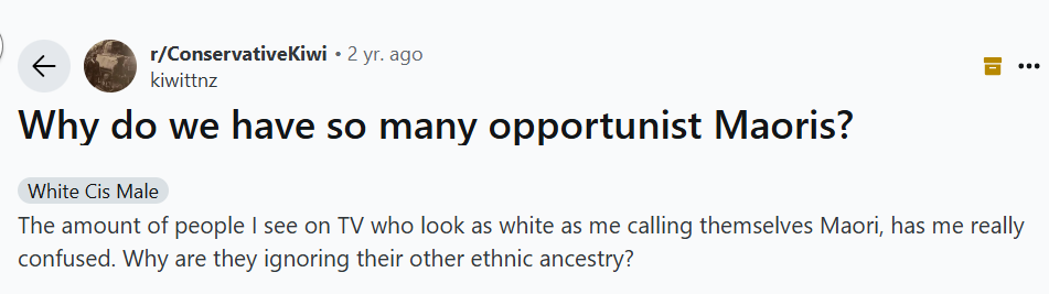 她指出,越来越多的非毛利裔白人(Pākehā),在没有任何毛利血统或社区背景的情况下,开始自我认同为毛利人。