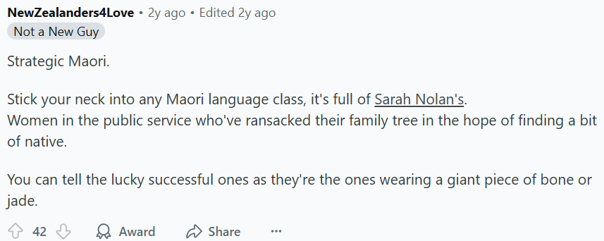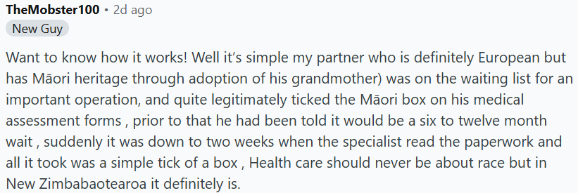 “我的伴侣是绝对的欧裔,但是他那被领养的祖母有毛利血统。他最近在等待一项重要的手术,于是在医疗评估上勾选了毛利人一项。本来要等6到12个月的手术,在医生看到报告后突然间缩短到两周。医疗不应该区别对待不同种族,但在新西兰就是这样。”