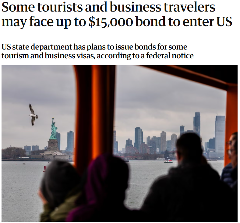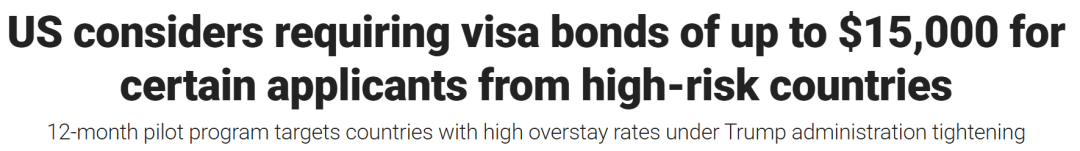 突发!美国国务院提议,要求部分商务和旅游签证(B1/B2签证)申请人需缴纳高达1.5万美元的签证保证金才能进入美国,此举可能会使许多人无力承担入境费用。