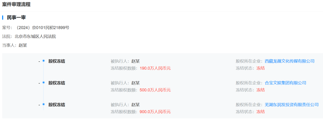 • 合宝文娱集团有限公司——冻结约 500 万元(赵薇持股约 4.5%)