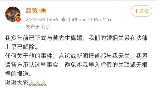 两人的婚姻自始就存在裂痕,媒体称婚姻基础并不牢固,据传于 2021 年秘密离婚,赵薇直至 2024 年 12 月才公开声明:“我多年前已正式与黄先生离婚……婚姻关系在法律上早已解除”。
