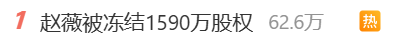 2025 年 8 月 4 日,赵薇名下三家公司股权被北京市东城区人民法院冻结,总金额达 1590 万人民币,冻结期为 3 年,执行原因系与中国民生信托保证合同纠纷相关。