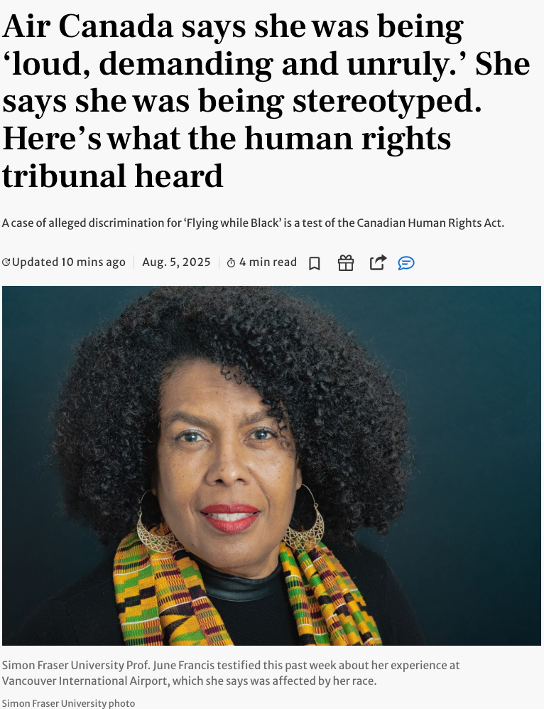 案件追溯至2018年3月1日,当时62岁、现在已经70岁牙买加裔黑人女性朱妮·弗朗西斯(June Francis)在温哥华国际机场乘搭航班前往多伦多开会。